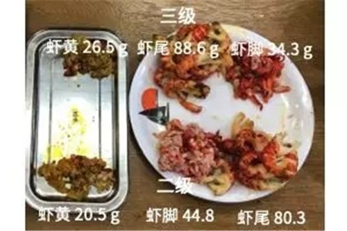 丁香医生团队做了实验,同等重量(500g)的二级(蒸熟后平均每只 45 g)小龙虾和三级(蒸熟后平均每只 30 g)小龙虾,解剖出来的总重量: