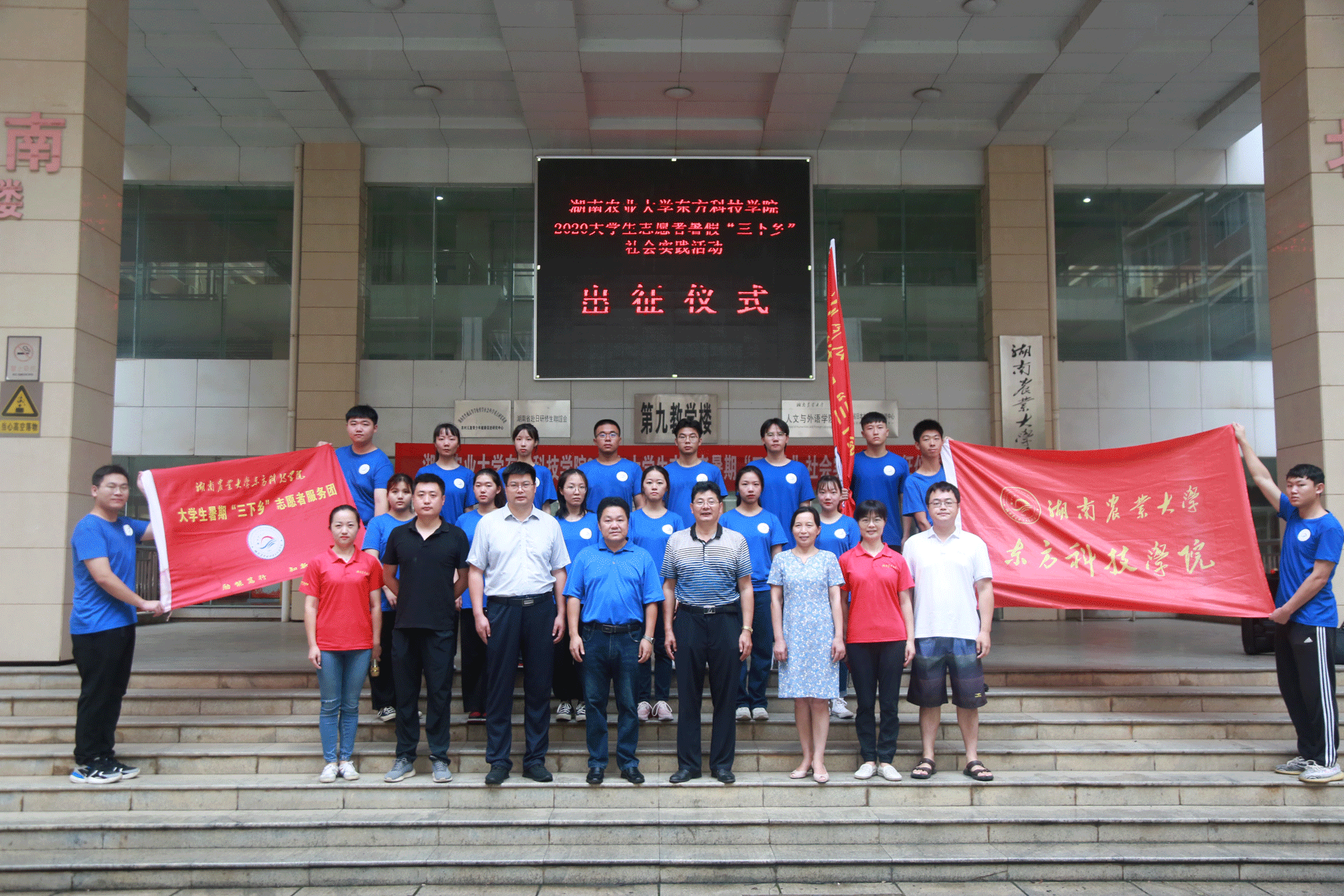 (通讯员 罗慧 韩柳 何杰文)8月10日上午,学院2020年大学生志愿者暑期“三下乡”社会实践活动出征仪式在第九教学楼前坪举行,学院常务副院长李觅路、党委书记史云峰、副院长蔡鑫萍、党委副书记副院长朱杰辉出席本次活动。参加本次活动的还有经管学部学工副主任贺际强、人文学部学工副主任赵文力、理工学部学工副主任杨琳,以及学院赴湖南省益阳市千山红镇大西港村的19名大学生志愿者。活动由学院团委副书记罗慧主持。