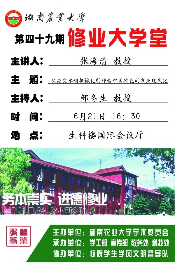 修业大学堂第四十九期——张海清教授主讲《从杂交水稻机械化制种看中国特色的农业现代化》