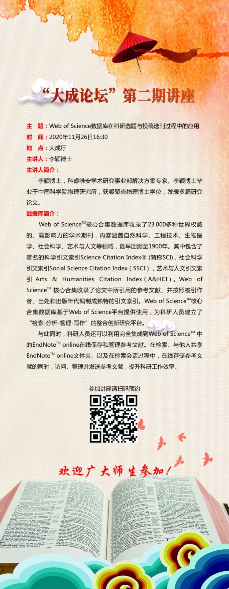 “大成论坛”第二期讲座:Web of Science数据库在科研选题与投稿选刊过程中的应用