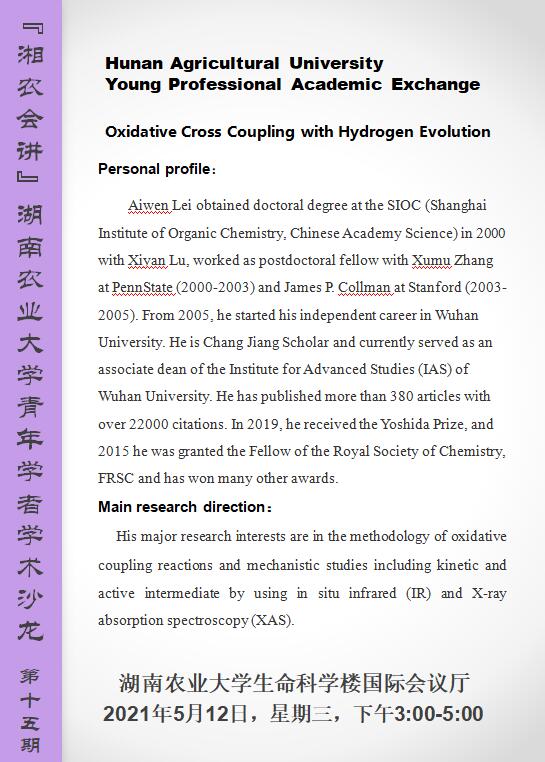 湖南农业大学青年学者学术沙龙第十五期--Oxidative Cross Coupling with Hydrogen Evolution