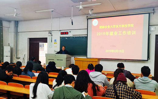 本网讯(招生就业创业指导中心 陈斌  杨帆)为积极做好2019届毕业生就业服务工作,确保更高质量和更充分就业,315日下午,学院在九教北101多媒体教室举办2019年就业工作专题培训,校招生就业指导处副处长姚文昌、校就业指导中心主任徐锋担任主讲嘉宾,学院副院长刘湘辉主持,学院招生就业创业指导中心、培训与对外交流服务中心全体工作人员,各学部学工副主任、就业专干、毕业班辅导员,学院大学生就业与创新创业服务中心副部长以上学生干部,各学部学生会就业创业服务部部长、副部长等参加培训。