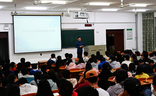 刘明亮老师以校园礼仪为切入点,重点讲授了如何处理好师生关系、同学关系,在校园、教室、宿舍应该如何树立良好的形象。刘明亮老师时而引经据典,时而列举实例,将礼仪的基本原理、现实适用,握手、引导、介绍、问候、形象礼仪,着装搭配等都进行了详细的讲授,既有理论介绍,又有实际操作。同学们认真思考,积极参与,气氛非常热烈。讲座结束后同学们争相举手,就自己生活和学习中碰到的礼仪问题提问,刘老师一一进行了耐心细致地解答,原定一小时的讲座延长到将近两小时。