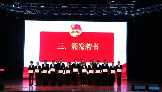 大会在《中国共产主义青年团团歌》中拉开序幕,学院副书记兼副院长朱杰辉宣读了新一届团委、学生会、学社联、全媒体中心干部名单。主席台就坐的嘉宾给新任的副部长以上学生干部颁发聘任证书。