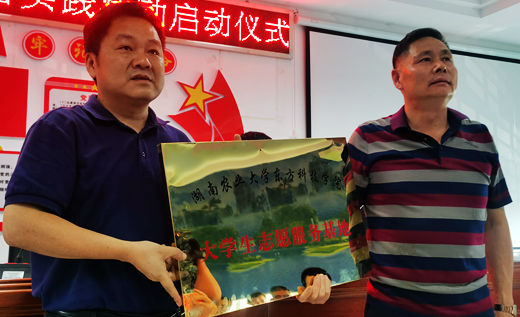 最后,史云峰将“湖南农业大学东方科技学院志愿服务基地”牌匾授予大西港村。